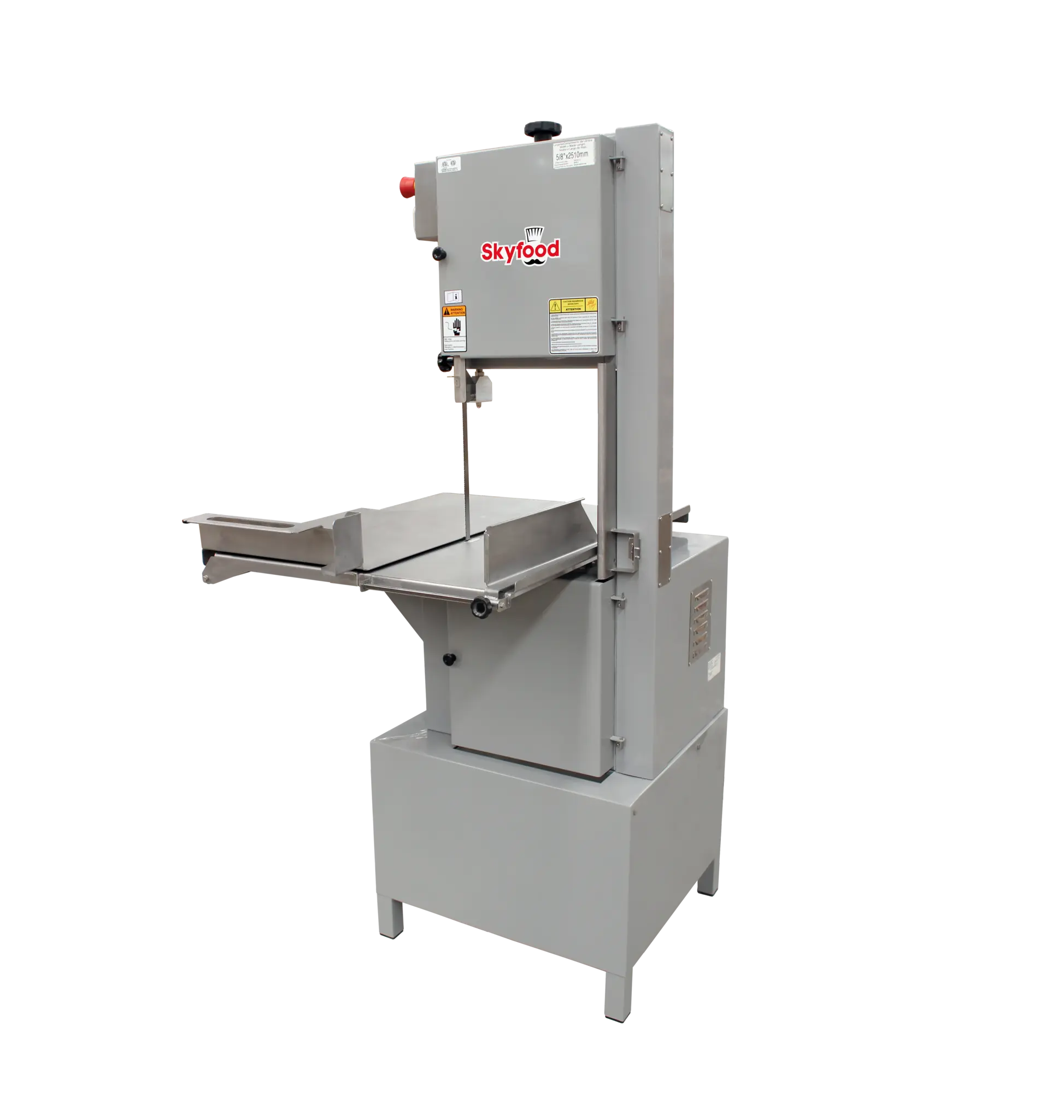Ensure reliability with the Skyfood Equipment SKEX Meat Bone Saw. This floor model saw is designed for heavy-duty use in commercial restaurants, offering a 98" blade and a cutting clearance of 10" high x 9-3/8" wide. The adjustable blade guides and balanced saw blade wheels ensure precise and efficient cutting, while the safety and toggle switch provide added security. The stainless steel sliding and stationary table, along with the stainless steel column guard, guarantee durability and easy cleaning. With a steel base and painted finish, this meat bone saw is built to withstand the demands of a busy kitchen. Powered by 730 watts and 1 HP, it delivers reliable performance. The SKEX Meat Bone Saw is cETLus and ETL-Sanitation certified, ensuring it meets the highest safety and sanitation standards. Trust Skyfood Equipment for all your commercial restaurant needs.