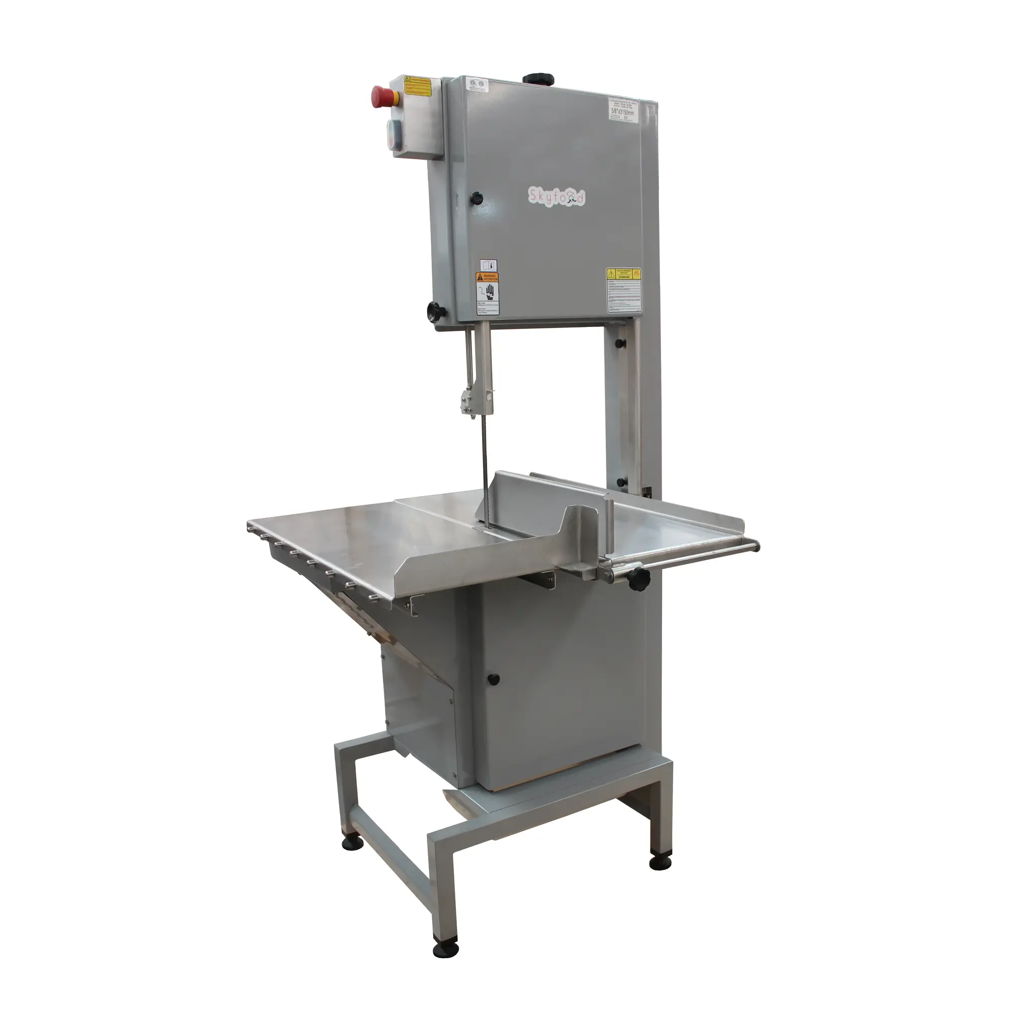 Optimize reliability with the Skyfood Equipment SKGE Meat Bone Saw. This floor model saw is designed to handle the toughest cutting tasks in a commercial restaurant setting. With a 124" blade and a cutting clearance of 14-1/8" high x 12-3/16" wide, this saw can effortlessly slice through meat and bone. The adjustable blade guides ensure precise and accurate cuts every time, while the safety and toggle switch provide added security. The balanced saw blade wheels with a rear lip enhance stability and control during operation. The stainless steel column guard protects against accidents, while the sliding and stationary table offer convenience and versatility. The steel base with a painted finish ensures durability and longevity. Powered by 1470 watts and a 2 HP motor, this saw delivers exceptional performance. Trust the Skyfood Equipment SKGE Meat Bone Saw for efficient and reliable cutting in your restaurant.