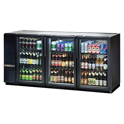 Experience kitchen innovation with the True Manufacturing TBB-24GAL-72G-HC-LD Back Bar Cabinet. This three-section cooler is designed to meet the demands of a busy commercial restaurant. With a capacity to hold 84 six-packs or 3 half kegs, this cooler ensures you never run out of cold beverages for your customers. The galvanized sub top and glass doors with locks provide durability and security, while the LED interior light illuminates the contents for easy visibility. The galvanized interior with a stainless steel floor is easy to clean, making maintenance a breeze. The black vinyl exterior adds a sleek and professional look to your establishment. Powered by R290 Hydrocarbon refrigerant and a 1/4 HP compressor, this cooler is energy-efficient and environmentally friendly. Made in the USA, this True Manufacturing Back Bar Cabinet is a reliable and high-quality addition to any commercial kitchen.