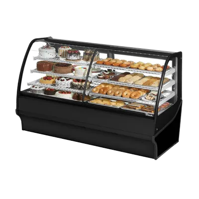 Elevate your culinary experience with the True Manufacturing TDM-DZ-77-GE/GE-S-S Display Case. This dual-zone merchandiser is perfect for commercial restaurants, offering both dry and refrigerated storage options. With a spacious 77-1/4" width, this display case provides ample room for showcasing your delectable creations. The curved glass front and glass sides create an elegant and inviting display, while the two rear sliding glass doors allow for easy access to your products. The three tiered levels of adjustable chrome plated wire shelves provide flexibility in organizing your items, with a total of six shelves included. The LED interior lighting illuminates your products, making them even more enticing to customers. Made in the USA with a stainless steel exterior and interior, this display case is not only durable but also easy to clean. With its R290 Hydrocarbon refrigerant and 1/4 HP self-contained refrigeration system, this display case ensures optimal temperature control for your perishable items. Trust True Manufacturing to deliver quality and reliability in your commercial restaurant.