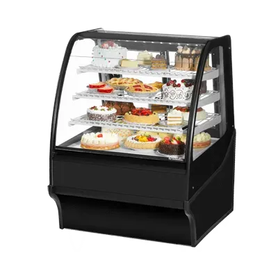Master the art of cooking with the True Manufacturing TDM-R-36-GE/GE-S-S Display Case. This refrigerated bakery display merchandiser is designed to showcase your delectable creations in a stylish and efficient manner. With its curved glass front and glass sides, customers will be enticed by the enticing display of your baked goods. The two rear sliding glass doors make it easy for staff to access and restock the shelves, which can be adjusted to three tiered levels to accommodate different sizes of pastries and desserts. The LED interior lighting illuminates your treats, making them even more irresistible. Made in the USA with a stainless steel exterior and interior, this display case is not only durable but also easy to clean. The use of R290 Hydrocarbon refrigerant ensures energy efficiency, while the 1/4 HP compressor provides reliable cooling. Perfect for commercial restaurant use, this True Manufacturing display case is a must-have for any bakery or cafe.