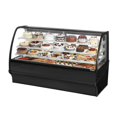 Empower your kitchen staff with the True Manufacturing TDM-R-77-GE/GE-B-W Display Case. This refrigerated bakery display merchandiser is designed to enhance the presentation of your baked goods while keeping them fresh and delicious. With its curved glass front and glass sides, this display case provides a clear view of your delectable treats from all angles. The two rear sliding glass doors make it easy for your staff to access and restock the display. The three tiered levels of adjustable white PVC coated wire shelves allow for flexible arrangement of your products. The LED interior lighting illuminates your baked goods, making them even more enticing to customers. Made in the USA, this display case is built to last with a black powder coated exterior and a white powder coated interior. It operates on R290 Hydrocarbon refrigerant and features a 1/2 HP compressor, ensuring efficient cooling. Trust True Manufacturing to deliver a high-quality display case that will elevate your bakery's presentation and drive sales.