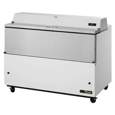 Unleash your kitchen's potential with the True Manufacturing TMC-49-HC Milk Cooler / Station. This mobile milk cooler is designed to meet the demands of a commercial restaurant, ensuring that your milk stays fresh and easily accessible. With its forced-air cooling system, this cooler maintains a temperature range of 33 - 38F, keeping your milk at the perfect serving temperature. The stainless steel drop front and hold-open flip-up lids provide easy access to the 12 crates of milk that this cooler can hold. The lock feature ensures the security of your milk supply. The white vinyl exterior and aluminum interior with a stainless steel floor not only make this cooler durable but also easy to clean. The three heavy-duty floor racks allow for organized storage, while the digital thermometer allows for precise temperature monitoring. Made in the USA, this True Manufacturing milk cooler is a reliable and efficient addition to any commercial kitchen.