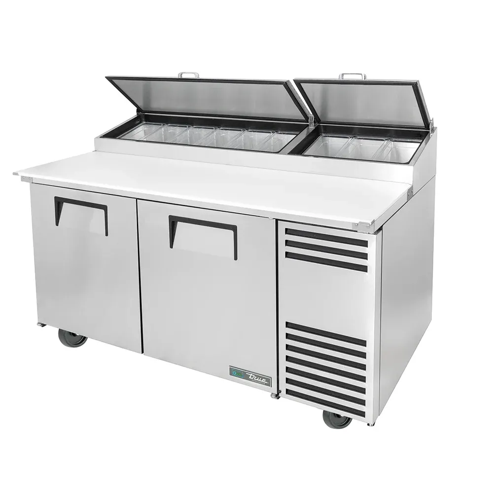 Streamline your restaurant cooking operations with the True Manufacturing TPP-AT-67-HC Prep Table. This high-quality prep table is designed to enhance efficiency and productivity in your commercial kitchen. With its stainless steel cover and 19-1/2"D cutting board, you can easily prepare and assemble pizzas with precision. The two full doors provide ample storage space for your ingredients, while the four PVC coated adjustable wire shelves allow for organized storage of other food items. The prep table also includes nine 1/3 size clear polycarbonate insert pans, ensuring that your toppings and ingredients are easily accessible. Made in the USA, this prep table features a durable aluminum interior with a stainless steel floor, ensuring long-lasting performance. The front breathing design and 5" castors make it easy to move and position the table wherever it's needed. With its efficient refrigeration system and R290 Hydrocarbon refrigerant, this prep table is not only energy-efficient but also environmentally friendly. Upgrade your restaurant kitchen with the True Manufacturing TPP-AT-67-HC Prep Table and experience enhanced productivity and organization.
