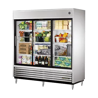 Ignite culinary passion with the True Manufacturing TSD-69G-LD Refrigerator, Reach-In. This top-of-the-line refrigerator is a must-have for any commercial restaurant. With its sleek stainless steel front and aluminum sides, it not only looks great but is also built to last. The clear coated aluminum interior with a stainless steel floor provides durability and easy cleaning. The three glass sliding doors allow for easy access to your ingredients while keeping them visible for quick inventory checks. The nine PVC coated wire shelves provide ample storage space for all your perishable items. The LED interior lighting ensures that everything is well-lit and easy to find. With a 1/2 HP compressor, this refrigerator is powerful enough to keep your ingredients at the perfect temperature. Made in the USA and certified by cULus, UL EPH Classified, and CE, you can trust the quality and reliability of True Manufacturing. Upgrade your restaurant's refrigeration system with the True Manufacturing TSD-69G-LD Refrigerator, Reach-In.
