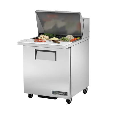 Mobilize your kitchen with the True Manufacturing TSSU-27-12M-B-HC Refrigerated Counter, Mega Top Sandwich/Salad Unit. This top-of-the-line unit is designed to meet the demands of a busy commercial restaurant. With its spacious interior, you can easily store and organize your ingredients. The unit comes with (9) 1/6 size and (3) 1/9 size poly pans, allowing you to keep a wide variety of toppings and fillings at the perfect temperature. The stainless steel insulated cover ensures that your ingredients stay fresh and protected. The 8-7/8" cutting board provides a convenient workspace for preparing sandwiches and salads. Made in the USA, this unit is built to last with its durable stainless steel construction. The aluminum interior with a stainless steel floor is easy to clean and maintain. Equipped with 5" castors, this unit is easy to move around your kitchen. Upgrade your restaurant's efficiency and productivity with the True Manufacturing TSSU-27-12M-B-HC Refrigerated Counter, Mega Top Sandwich/Salad Unit.