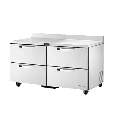 Ignite culinary passion with the True Manufacturing TWT-60D-4-HC~SPEC3 Refrigerated Counter. This work top refrigerator is a must-have for any commercial restaurant. With its SPEC Package 3, it offers a 16-gauge stainless steel top with a rear splash, ensuring durability and easy cleaning. The stainless steel front, sides, and back add a sleek and professional look to your kitchen. Inside, you'll find four drawers, each accommodating a 12" x 20" x 6" pan (not included), providing ample storage space for your ingredients. The electronic temperature control with a digital display allows you to easily monitor and adjust the temperature to keep your food fresh. The 5" castors make it easy to move the refrigerator around your kitchen, while the rear mount design ensures stability. Made in the USA, this True Manufacturing Refrigerated Counter is cULus and UL EPH Classified, guaranteeing its quality and safety. Upgrade your restaurant's kitchen with this reliable and efficient work top refrigerator.