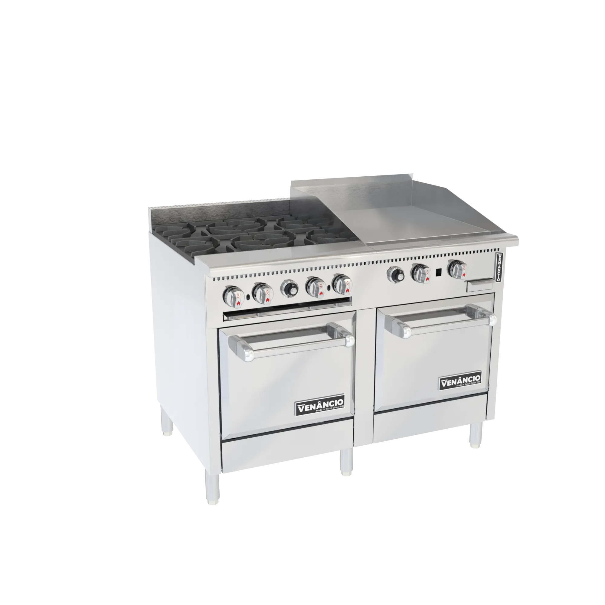 Restaurant Range built to deliver superior performance, durability, and efficiency for demanding commercial environments. This model features key enhancements such as gas and comes equipped with additional advantages including 48"w, (4) non-clog self-cleaning burners, removable cast iron grates. Designed with operators in mind, it offers dependable daily operation, easy maintenance, and optimized workflow support. From construction quality to performance-driven engineering, this unit provides the capability and reliability professionals expect.